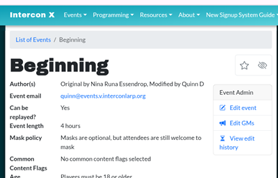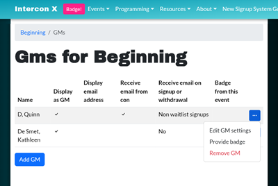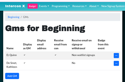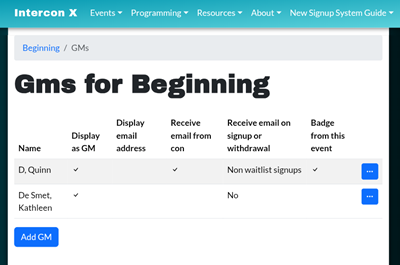 Please do not make structural changes to the game after it has been accepted without talking to the GM Coordinator! These would be changes to the game length or the number of players. However, adding GMs can be very easily done by yourself, and does not count as a structural change: if you refer back to the screenshots at the start of this newsletter, from the Edit GM screen, you can press Add GM to add someone as a GM, as long as they've logged into the Intercon X site at least once. From the Edit GM page, you can then click the “..”. and “Edit GM Settings” to set whether someone is publicly visible as a GM, whether their email address is publicly visible, and what sorts of convention email they should receive.