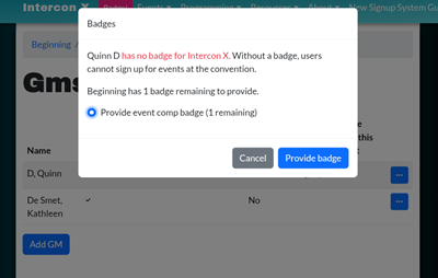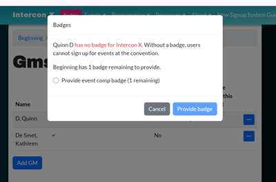 From this menu, click “...” next to the GM you wish to comp and select “Provide badge”.